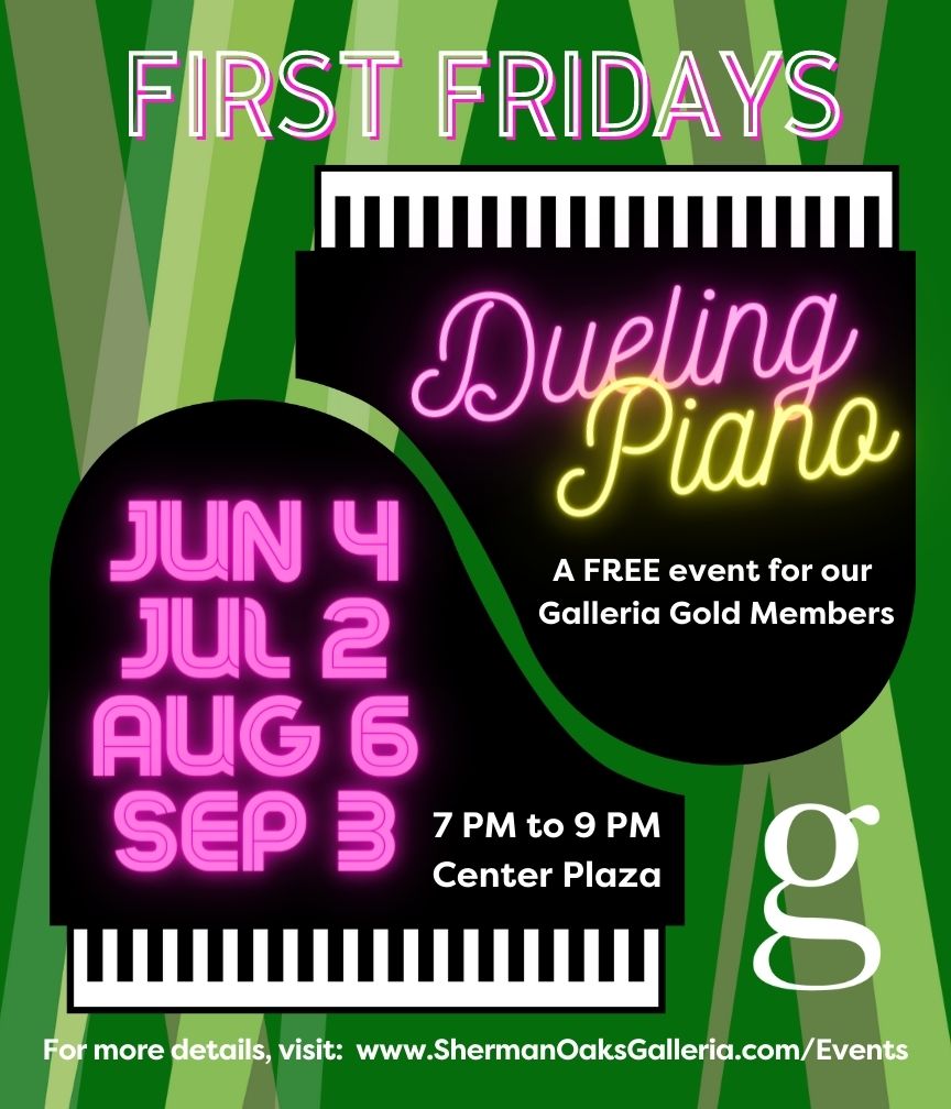 You demanded it, and we hear you! First Fridays are back at Sherman Oaks Galleria! Introducing our new dueling piano shows, we’re offering this free event every first Friday of the month from June until October. Come prepared to request your favorite songs as our pair of pianists riff off of each other, challenge each other, and take turns performing popular music live during this FREE high-energy show. This ain’t a trip to the opera, but we can promise family-friendly laughs and a fun time for all ages.